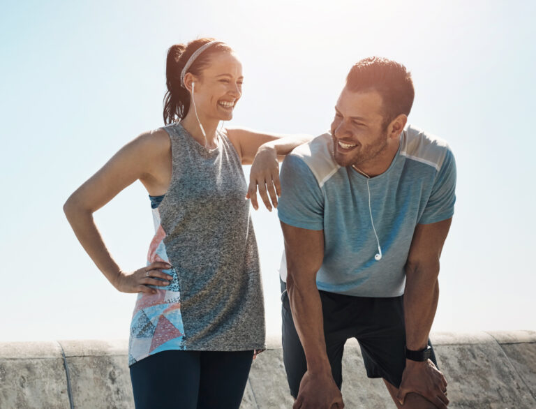 Running, fitness and couple relax in city listening to music, audio and radio for workout. Sports, wellness and man and woman outdoors for exercise, marathon training and resting by ocean together.